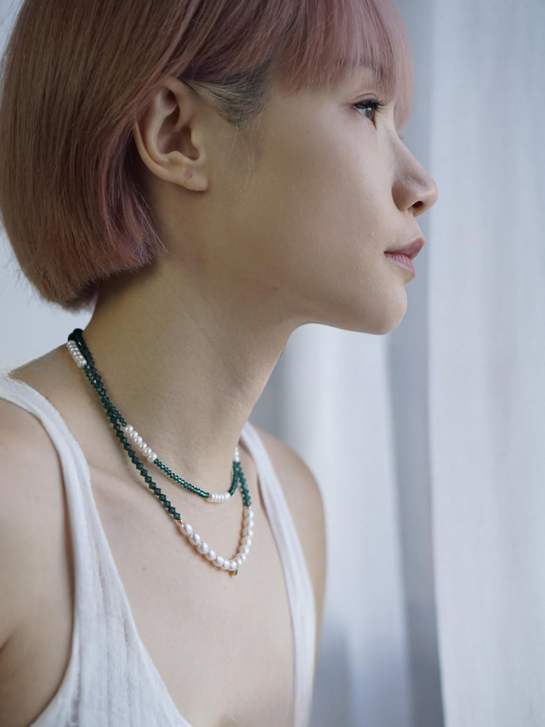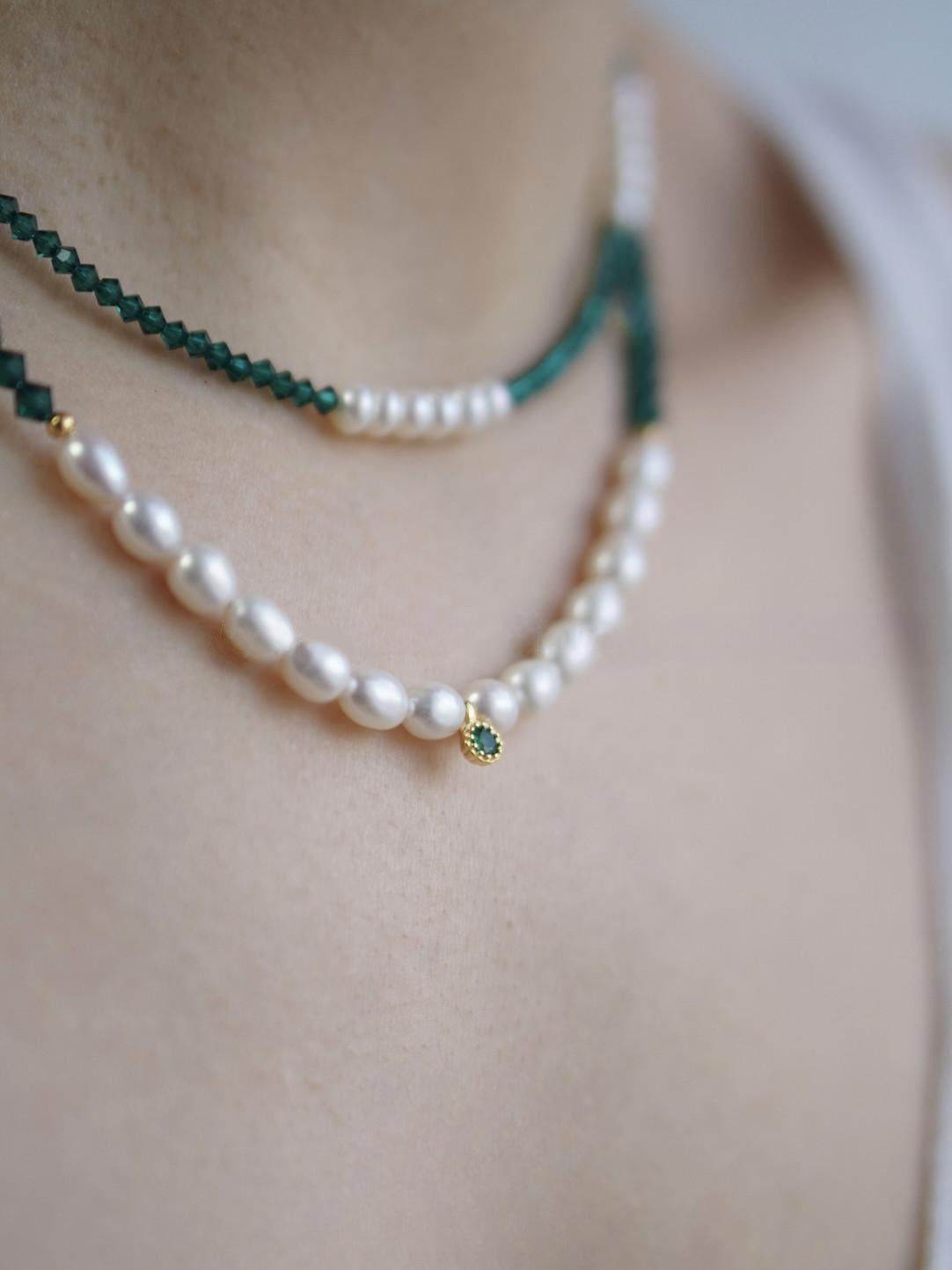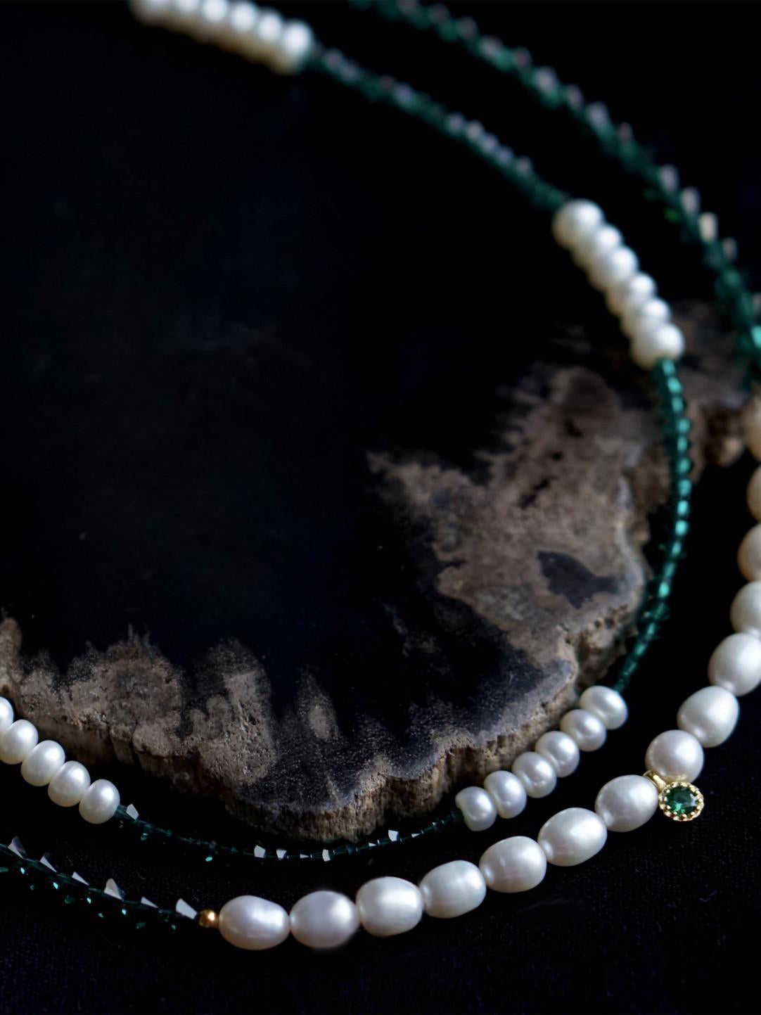 • Emerald Green Austrian Crystal Freshwater Pearl Layered Necklace