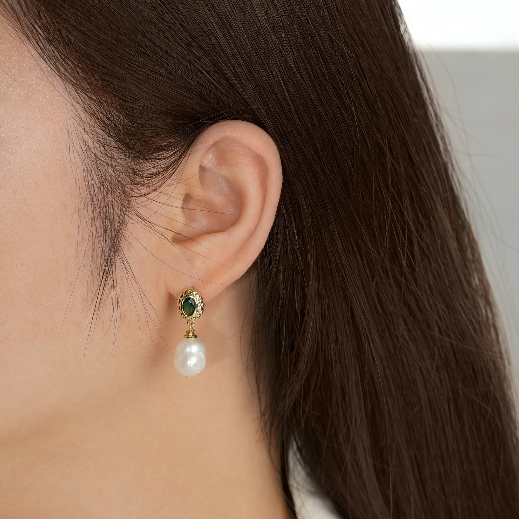 Material: Brass, Gold Plated, Natural Pearls, Synthetic Emerald, S925(Earrings Post Only)
