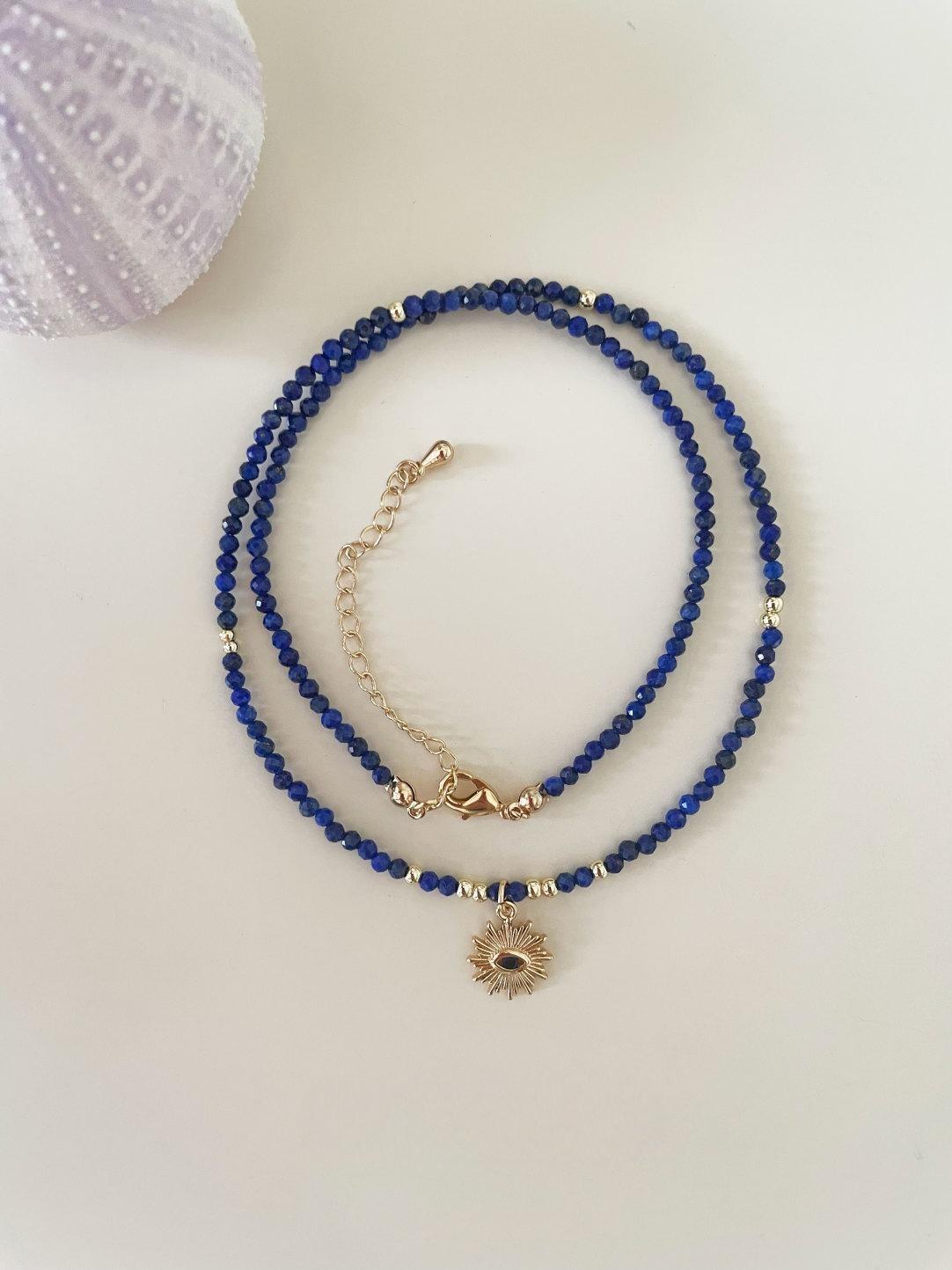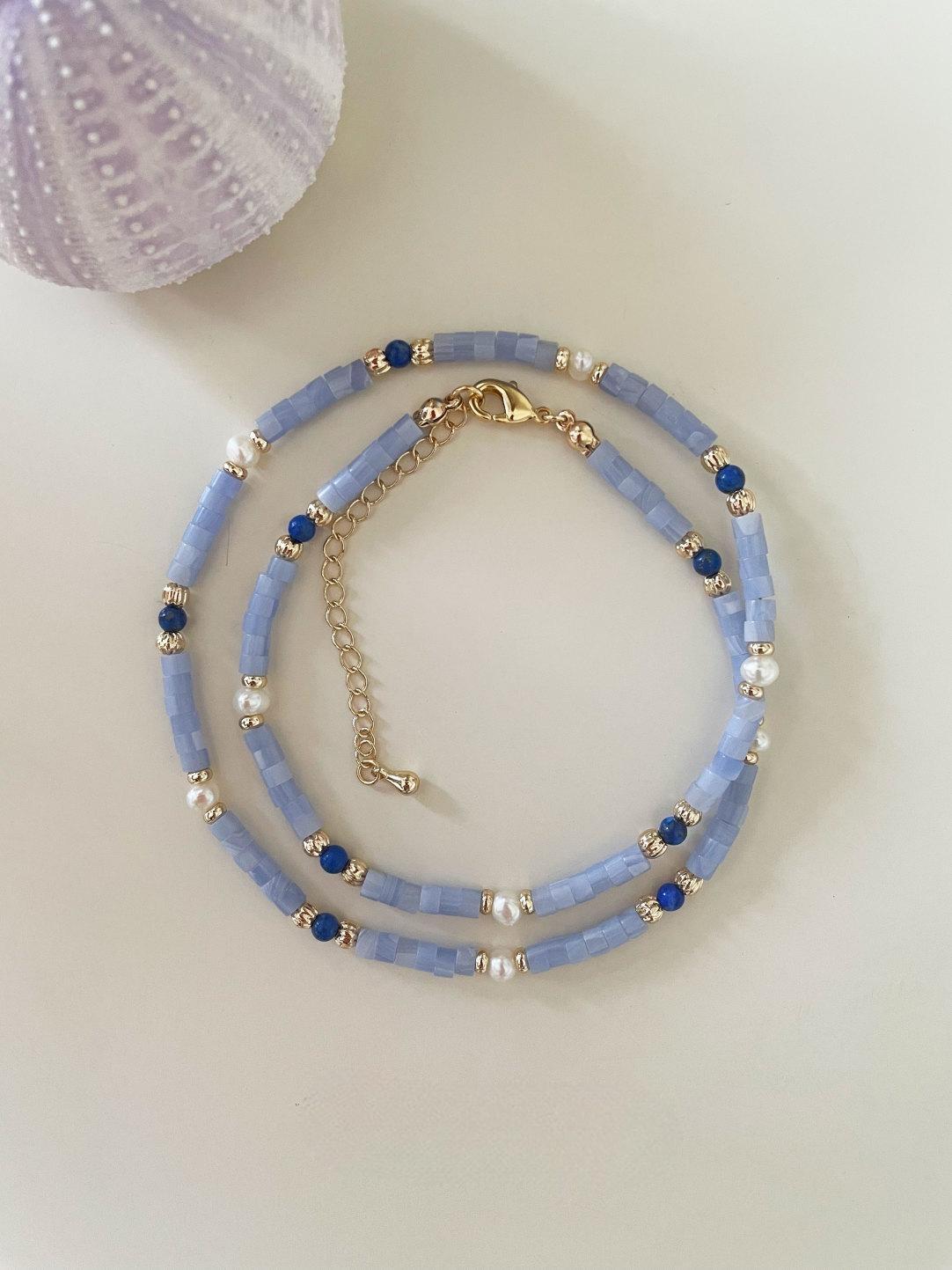 Material: Amethyst, lapis lazuli, freshwater pearls, gold-plated copper, blue zircon.