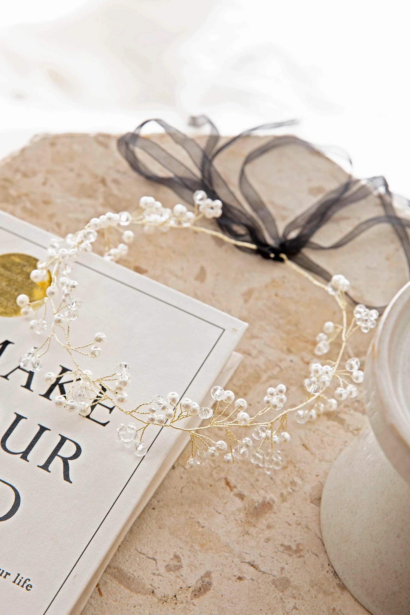 • Enchanted Pearl & Crystal Wire Headband Gold