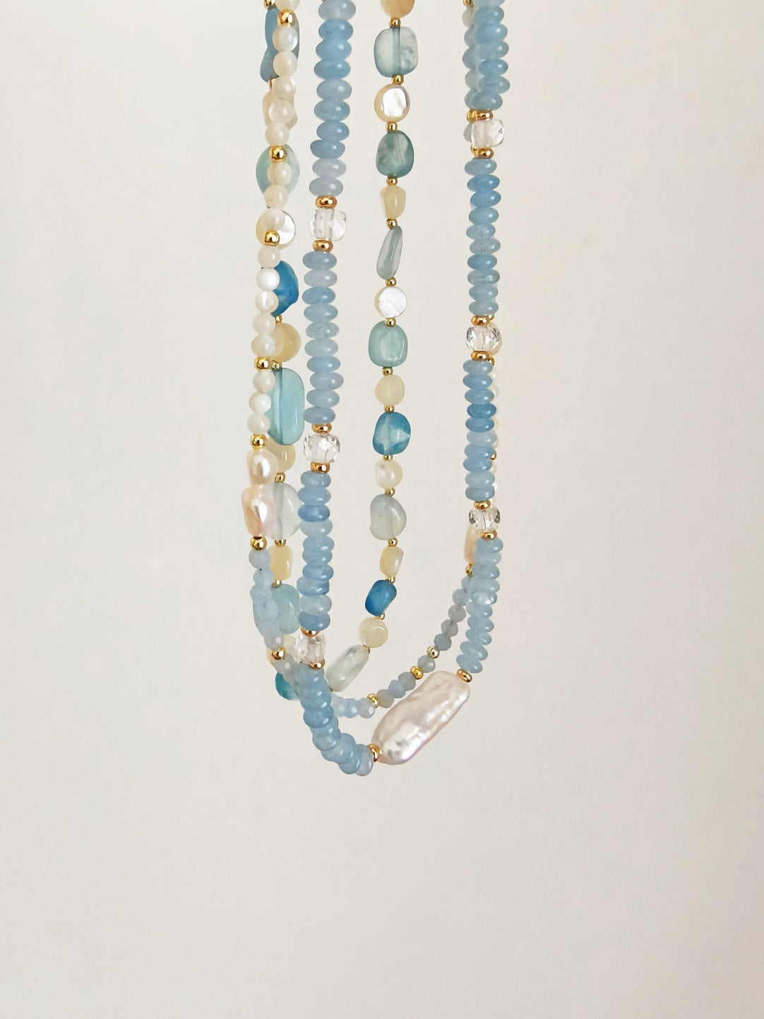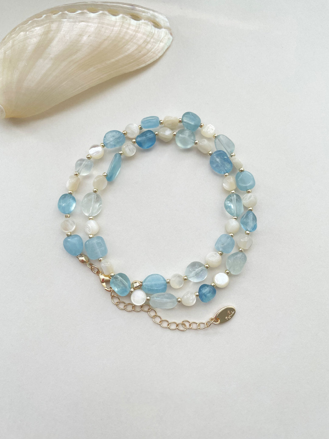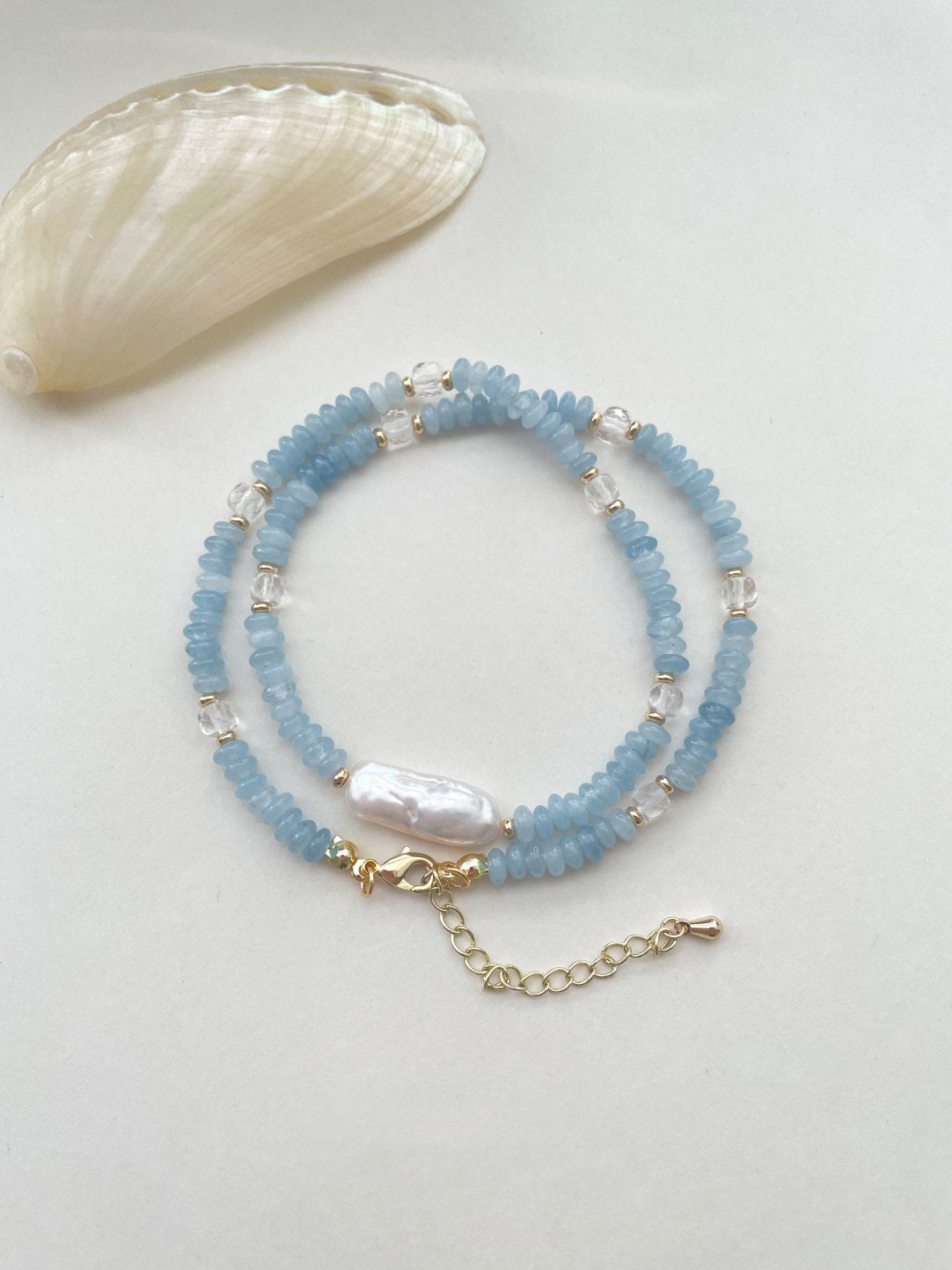Material: Aquamarine, natural shell, freshwater pearls, white crystal, 14k gold plating.