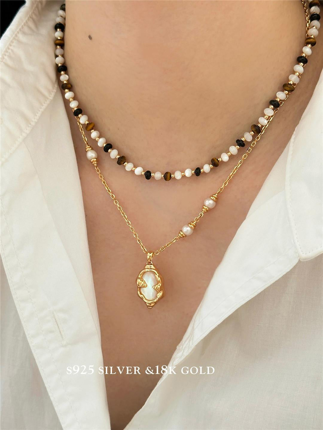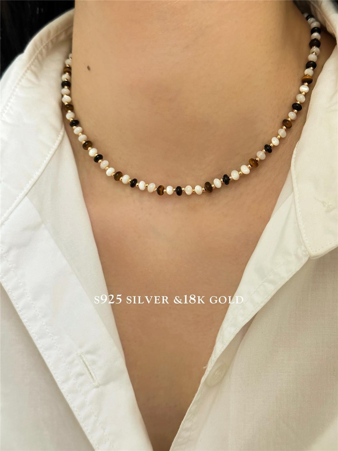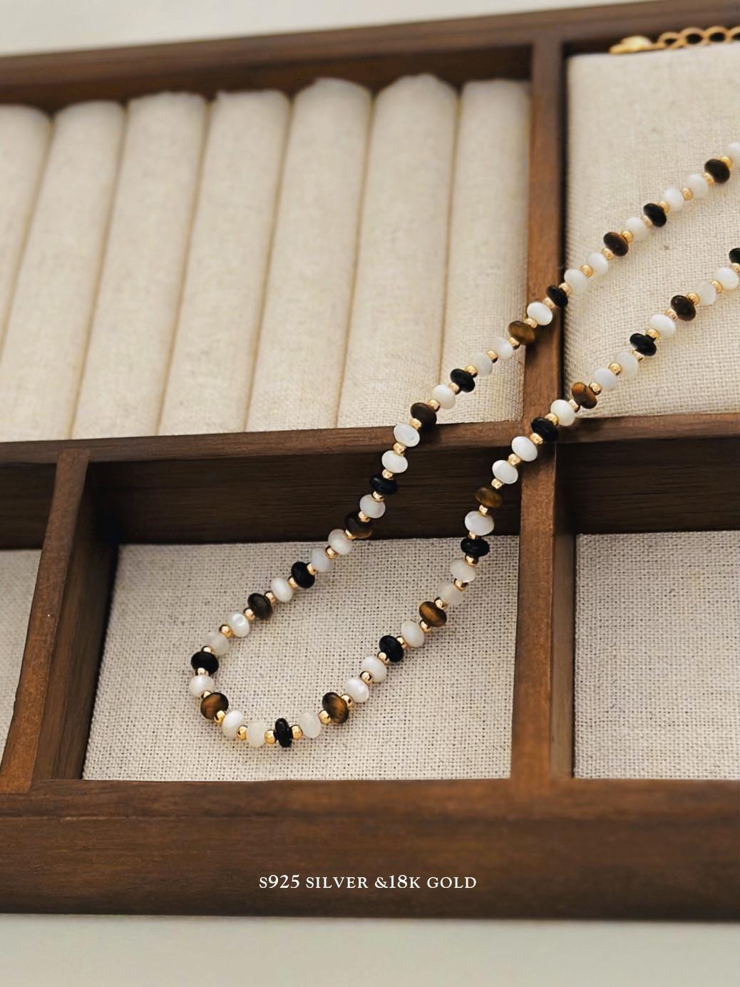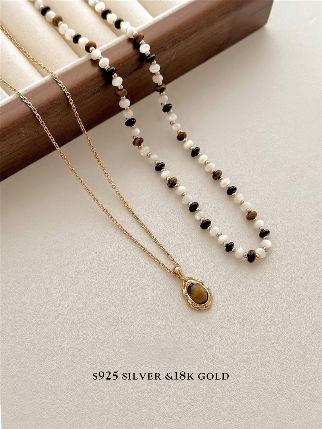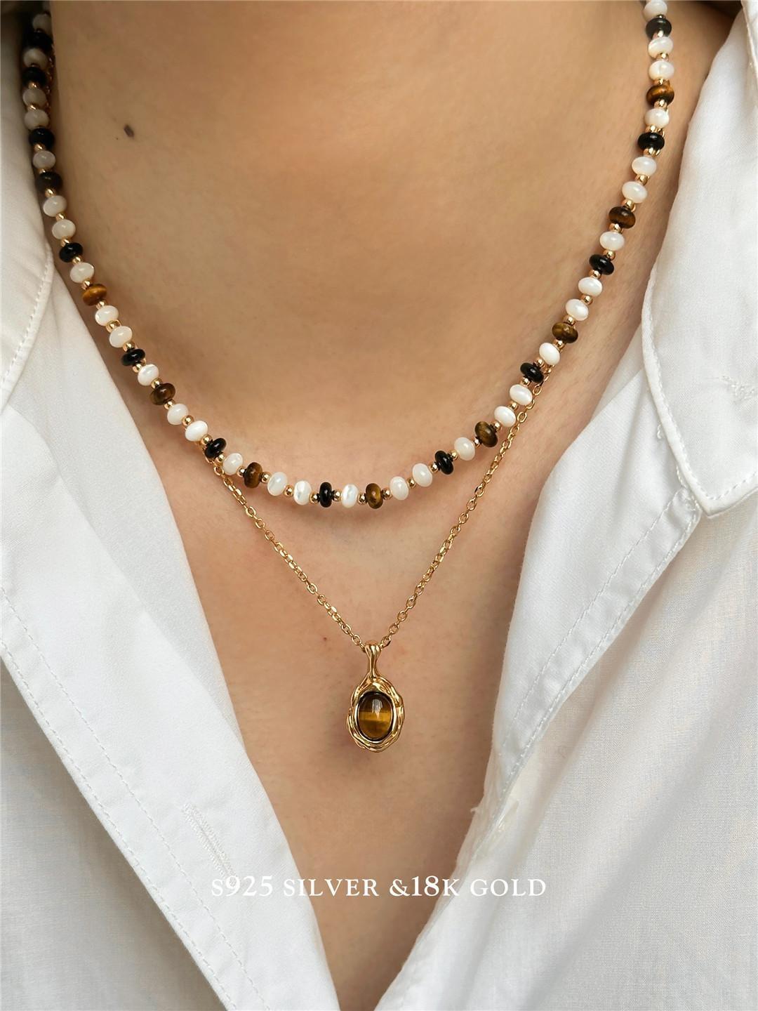 Materials: S925 silver plated with 18k gold, Tiger Eye, silver wire shell, and black agate.