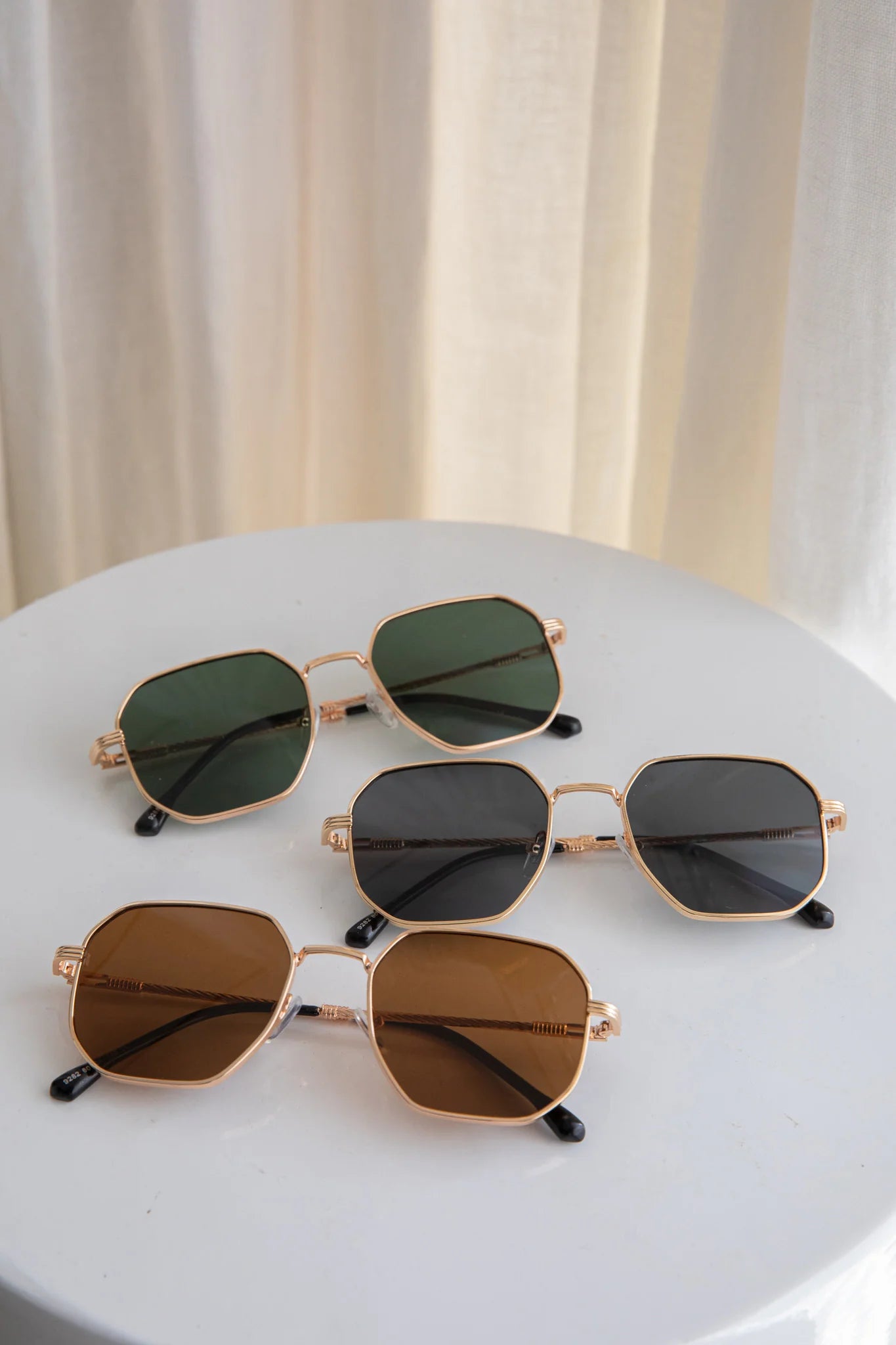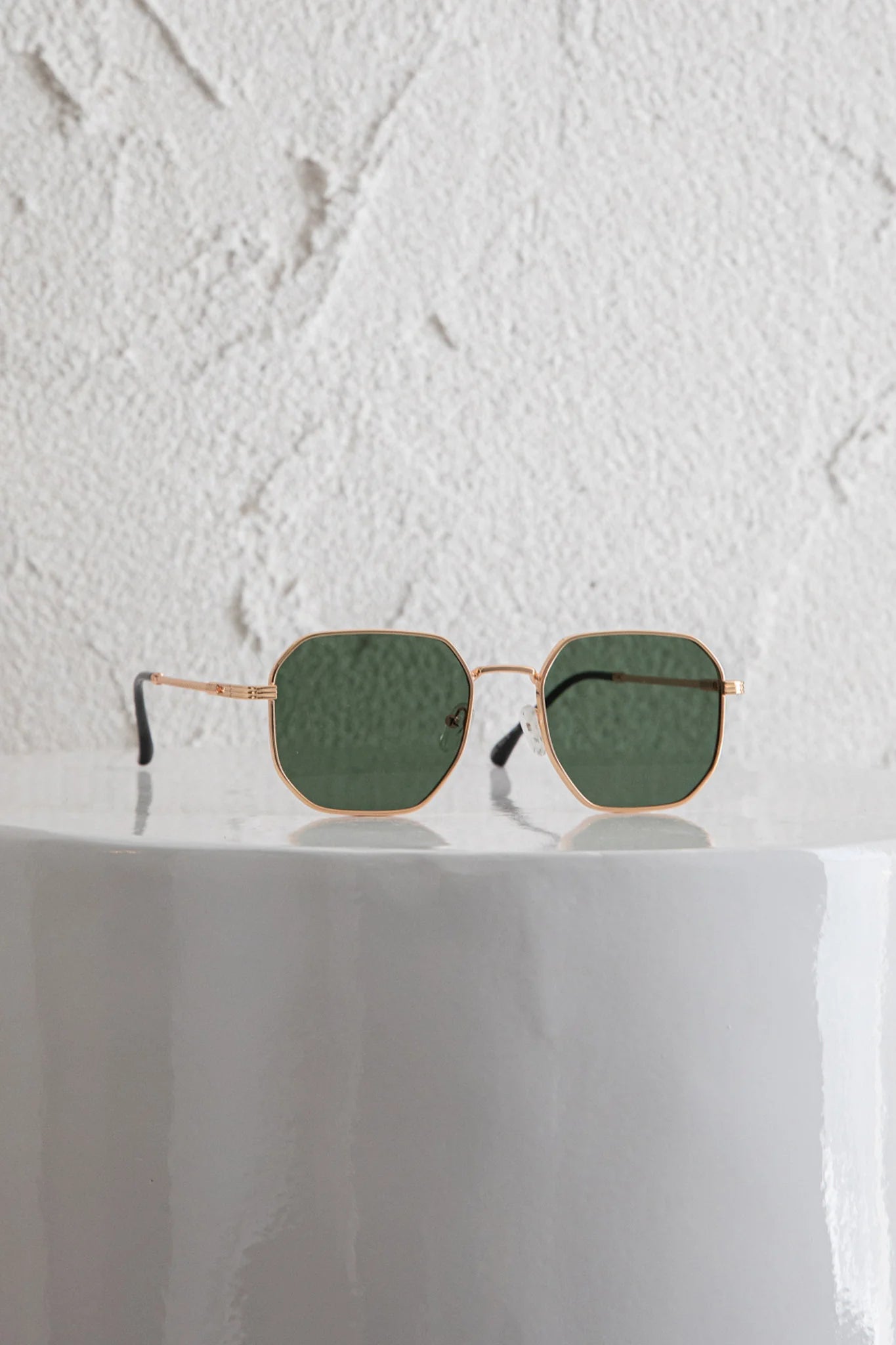 Turn heads in our classic Sahara sunglasses. Featuring unique green-tinted lenses and a gold frame. Perfect for sunny weekends, team them with mom jeans and a vintage band tee for an on-trend look.
